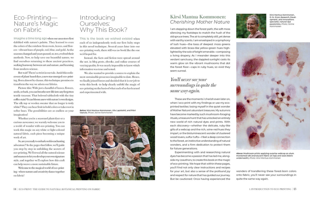 Ulla Lapiolahti holds both a BA in textile design and teaching credentials and has specialized in natural dye work and science for nearly 30 years. She pioneered a direct-printing method for natural dyes in 1999, has taught master classes around the world, and has educated thousands of Finnish textile professionals.
